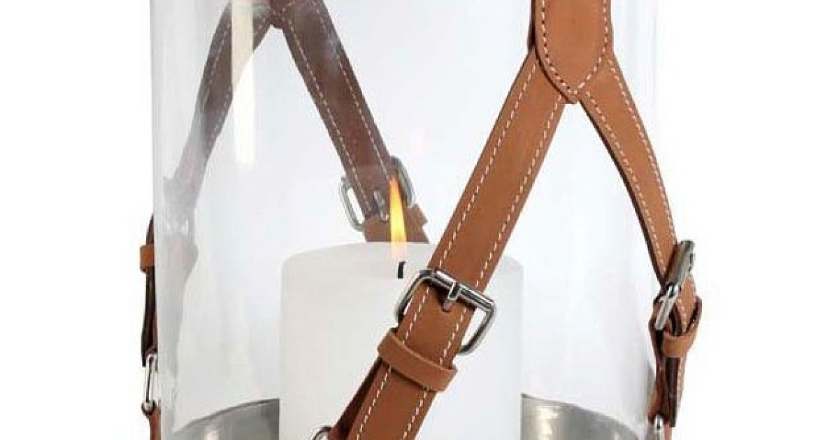 Стеклянная колба с ремнями из светло-коричневой кожи.