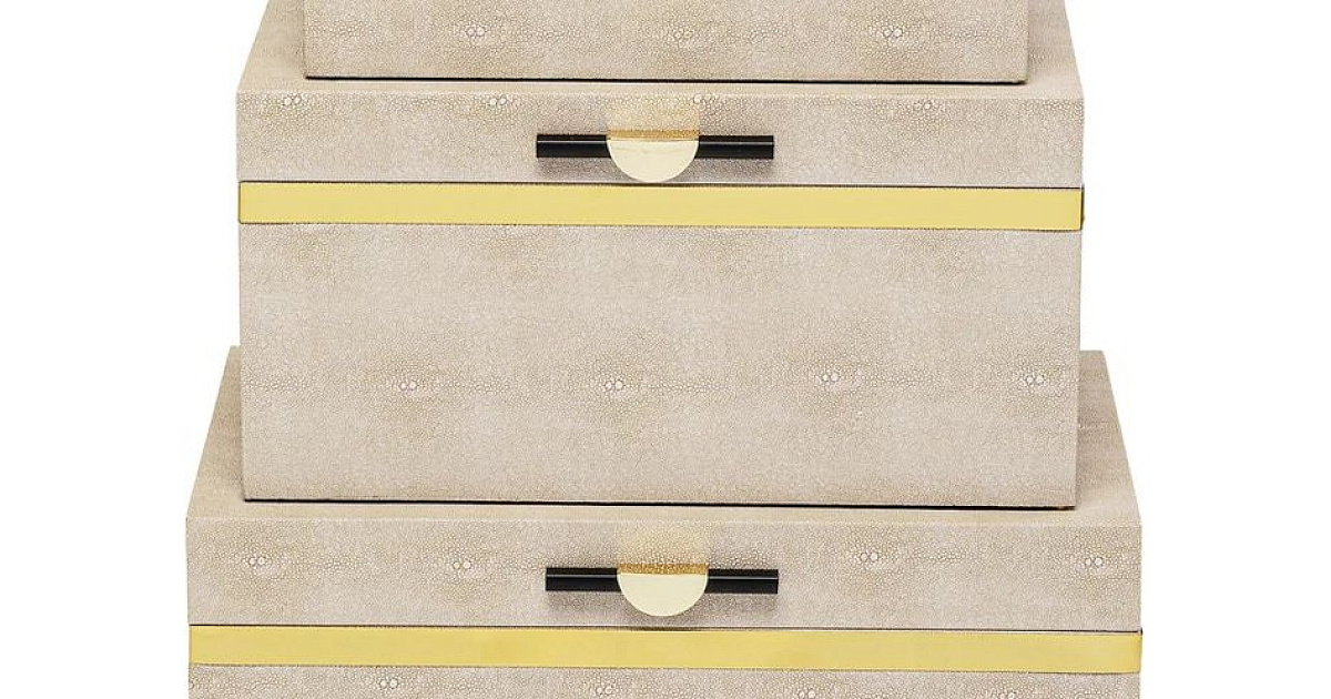 Бежевые коробки обтянуты текстилем с покрытием из кожи ската.