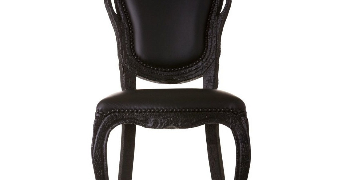 Обеденный стул Smoke Dining Chair с каркасом из дерева. Чтобы получить неповторимую структуру, основу стула подвергли воздействию огня. Сиденье и спинка обтянуты кожей черного цвета. Дизайн: Maarten Baas, 2002.