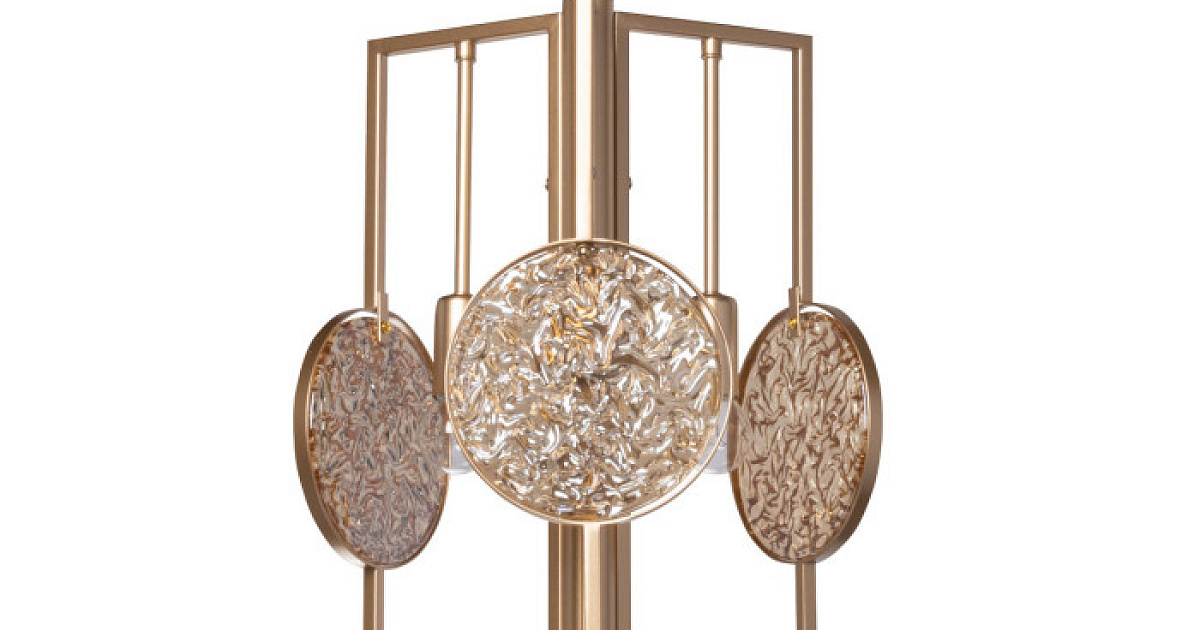 Металлическое основание подвесной люстры окрашено в цвет перламутрового золота. Декор выполнен из фактурного стекла, гальванизированного в цвет янтаря.