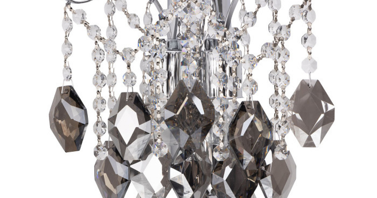 Хрустальный массивный декор дымчатого цвета оригинальной огранки и подвески из прозрачных октагонов создают красивую игру света.