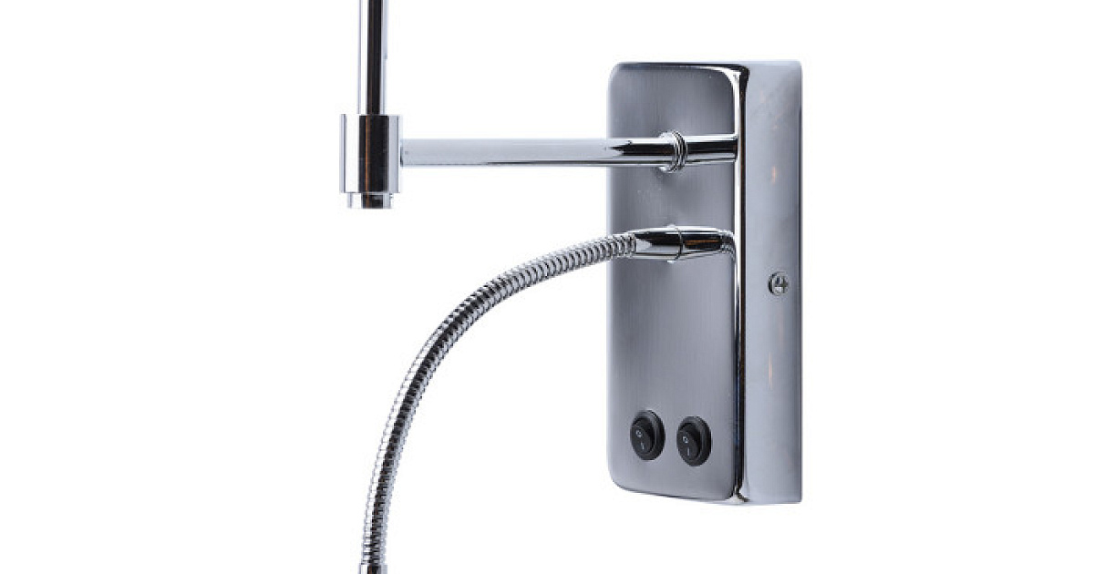 Арматура бра выполнена из сплава железа и гальванизирована в цвет хрома. Наверх направлен патрон для лампы накаливания на жестком держателе, гальванизированном в цвет хрома. Вниз направлен светодиод на гибкой отводке, также гальванизированной в цвет арматуры.