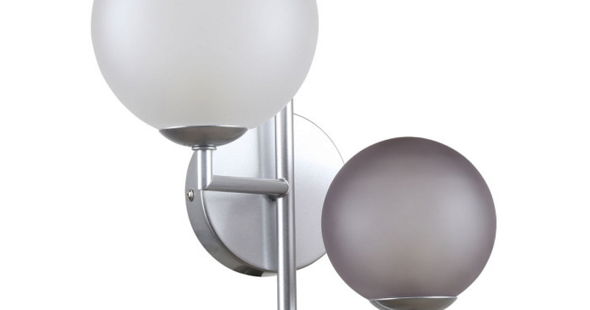 Металлическое основание настенного бра окрашено в цвет перламутрового серебра. Источники света закрыты стеклянными плафонами белого и дымчатого цвета.