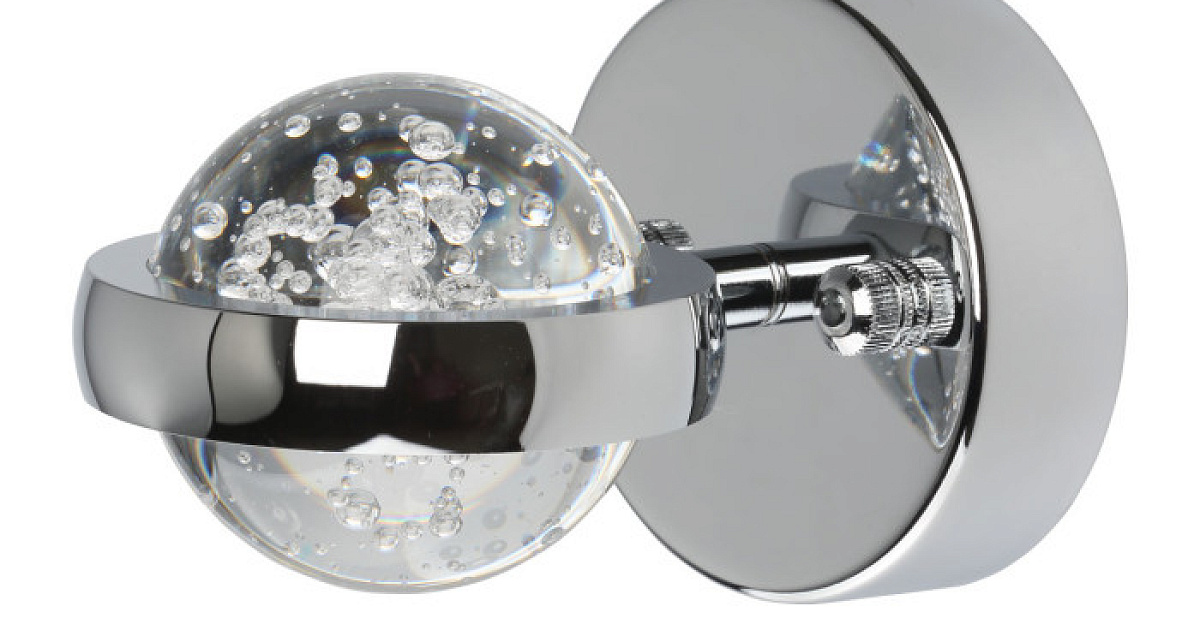 Трендовый цвет хрома. Сфера из прозрачного стекла с пузырьками красиво преломляет свет. Инновационный источник света актуален. Полная семья решает задачи общего и зонального освещения.