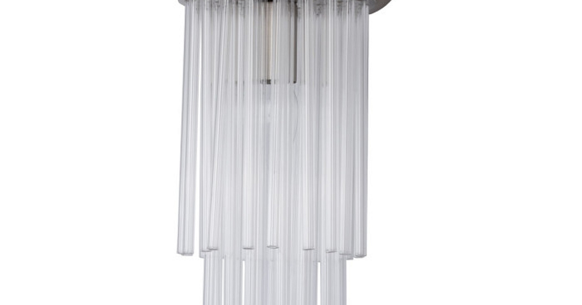 Металлическое основание настенного бра гальванизировано в цвет никеля. Светильник декорирован прозрачными стеклянными трубочками.