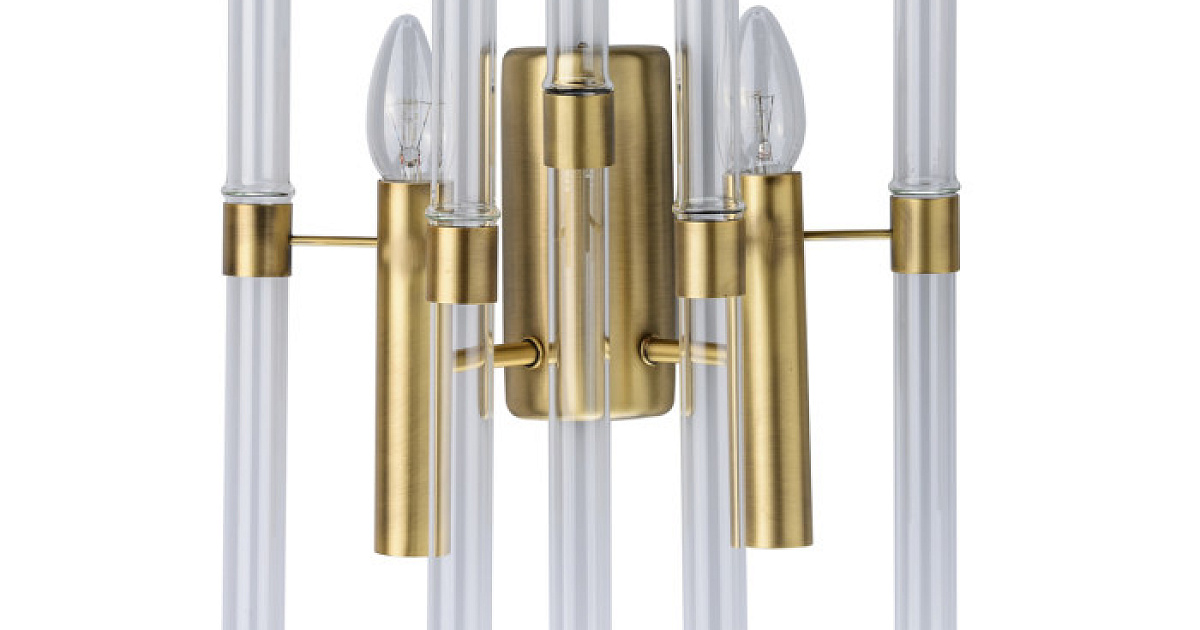 Основание бра выполнено из металла и гальванизировано в цвет латуни с патинированием. Декор в виде стеклянных полых трубок.