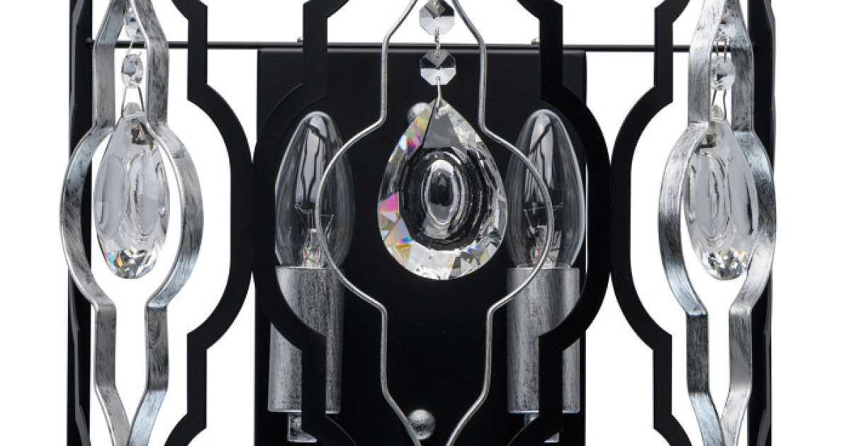 Основание светильника выполнено из металла и окрашено в черный цвет. Декоративные элементы на плафоне окрашены в цвет серебра. Декор из прозрачного хрусталя миндалевидной формы.