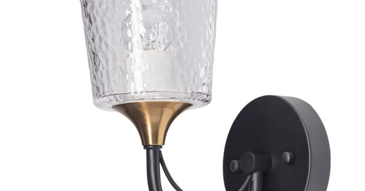 Металлическое основание окрашено в черный цвет. Отдельный элемент основания гальванизирован в цвет бронзы. Настенное бра декорировано плафоном из прозрачного фактурного стекла.