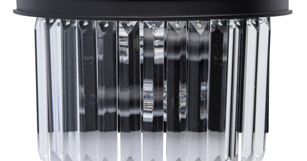 Основание бра выполнено из металла и окрашено в черный матовый цвет. Светильник декорирован прозрачным хрусталем прямоугольной формы.