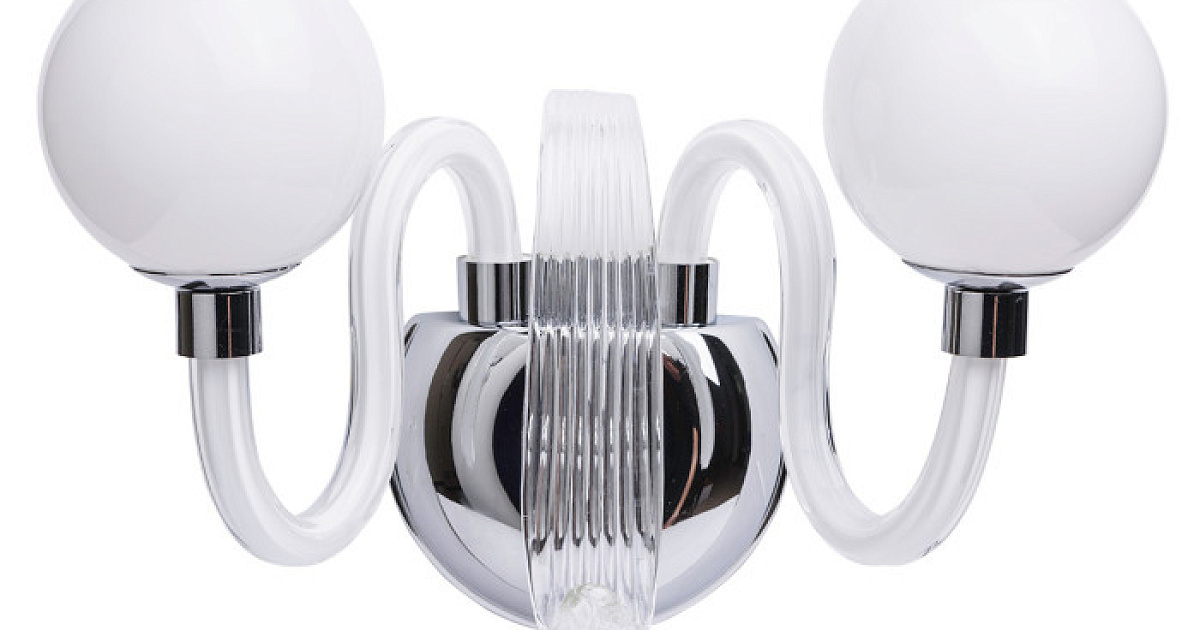Корпус бра выполнен из сплава железа и гальванизирован в цвет хрома. Рожки светильника выполнены из стекла, окрашенного изнутри. Плафоны в форме шаров выполнены из стекла, окрашенного в массе. Светильник декорирован элементами из гутного стекла, выполненными по технологии вытягивания.