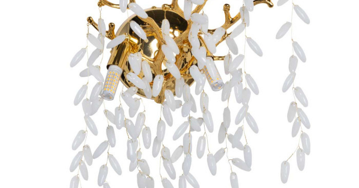 Основание настенного бра выполнено по технологии художественного литья из сплава алюминия с цинком и гальванизировано в цвет золота. Настенное бра декорировано гроздьями из белого матового стекла.