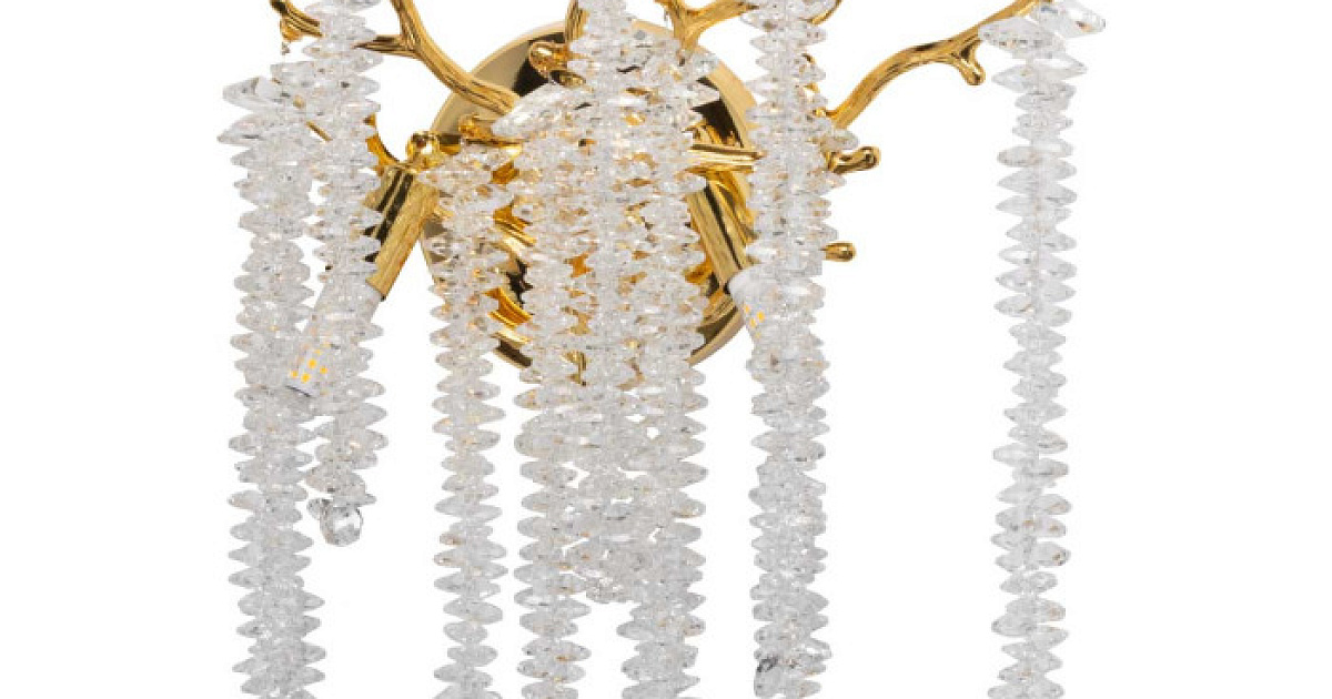 Основание настенного бра выполнено по технологии художественного литья из сплава алюминия с цинком и гальванизировано в цвет золота. Настенное бра декорировано гроздьями из прозрачного хрусталя.