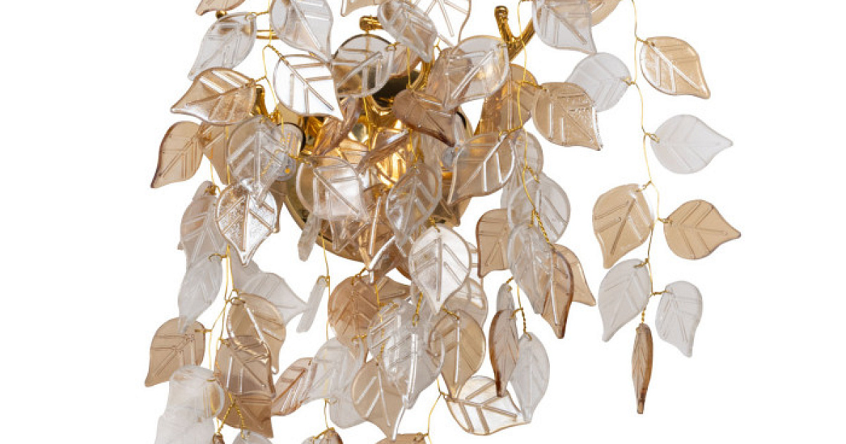 Современный дизайн с природными мотивами. Трендовая флористика, природа в доме. Декор в форме листьев из прозрачного и янтарного стекла придает светильнику индивидуальность. Заменяемые источники света удобны в эксплуатации.