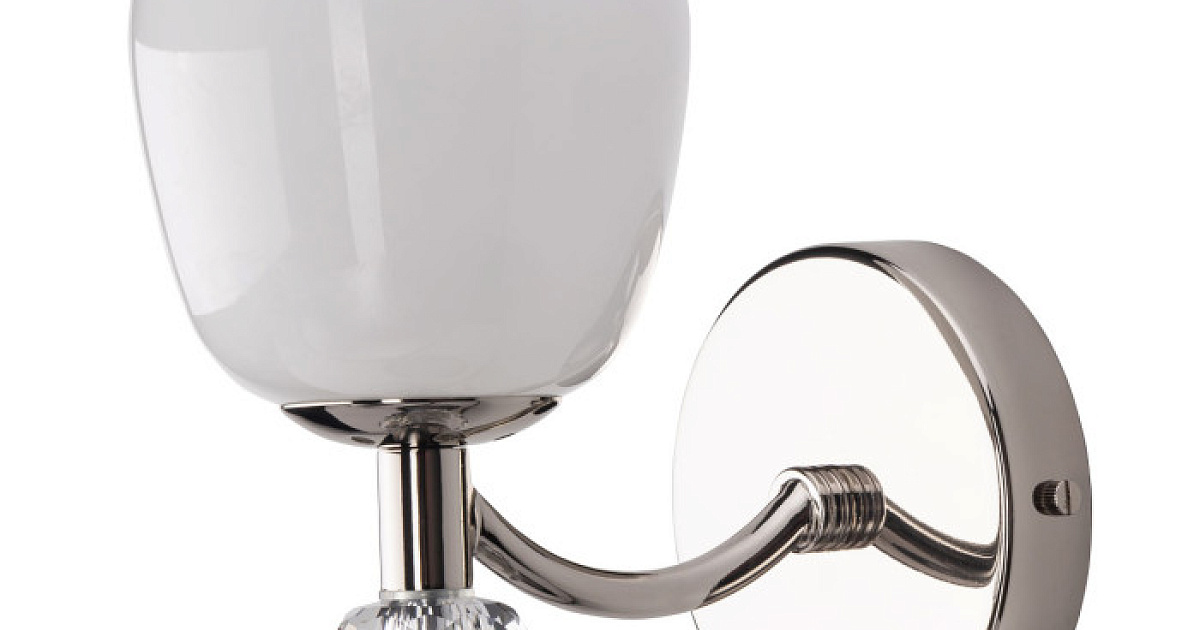 Металлическое основание бра гальванизировано в цвет хрома. Стеклянный плафон вытянутой формы окрашен в белый цвет изнутри. Настенное бра декорировано прозрачным массивом хрусталя.