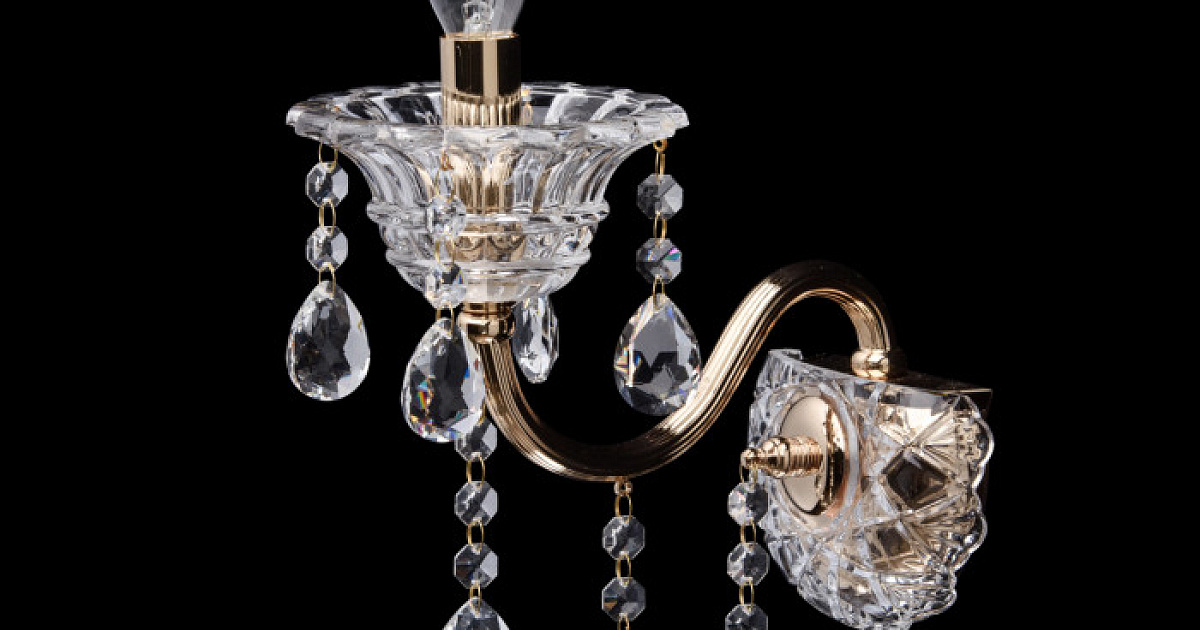 Арматура бра выполнена из стали и гальванизирована в цвет французского золота. Рожок профилирован и выполнен по технологии проката на роликовом станке. Декоративные розетки выполнены из стекла, отлитого в сложную форму. Светильник декорирован подвесками из хрусталя формы октагон и миндаль.