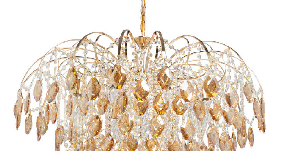 Светильник декорирован хрусталем в форме ромбов, гальванизированным в цвет янтаря и прозрачным хрусталем в форме октагонов.