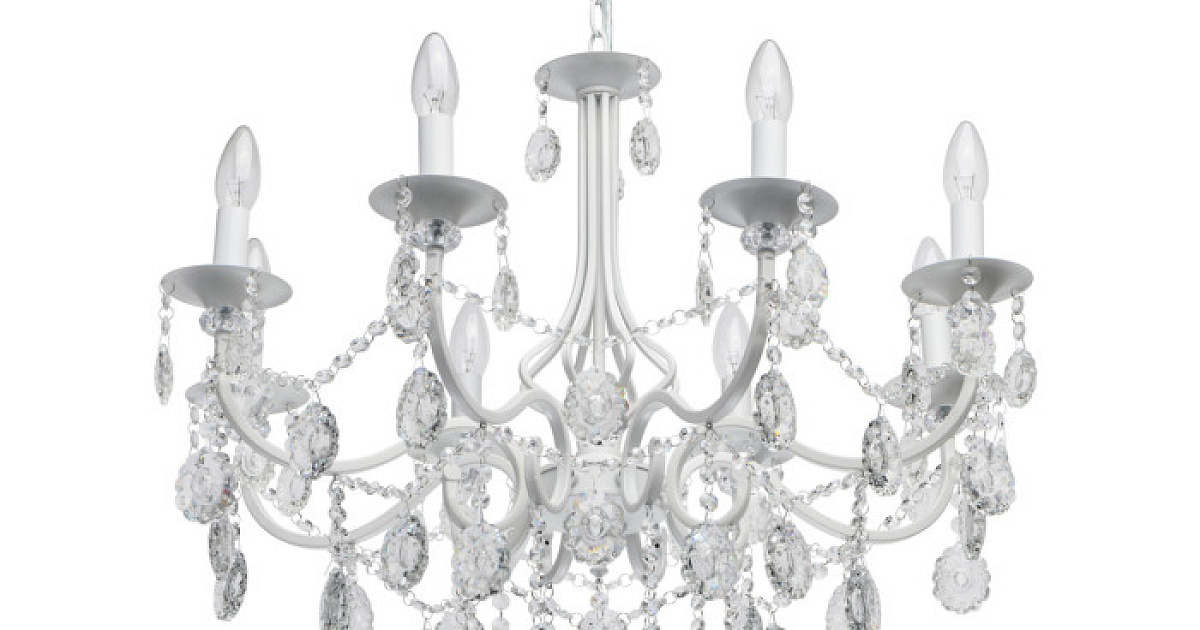 Классическая форма рожков-свечей с основанием белого цвета художественной формы. Хрустальные подвески оригинальной формы, цепочки из прозрачных хрустальных октагонов обеспечивают игру света. Массив хрусталя украшает розетки и создает дополнительный акцент.