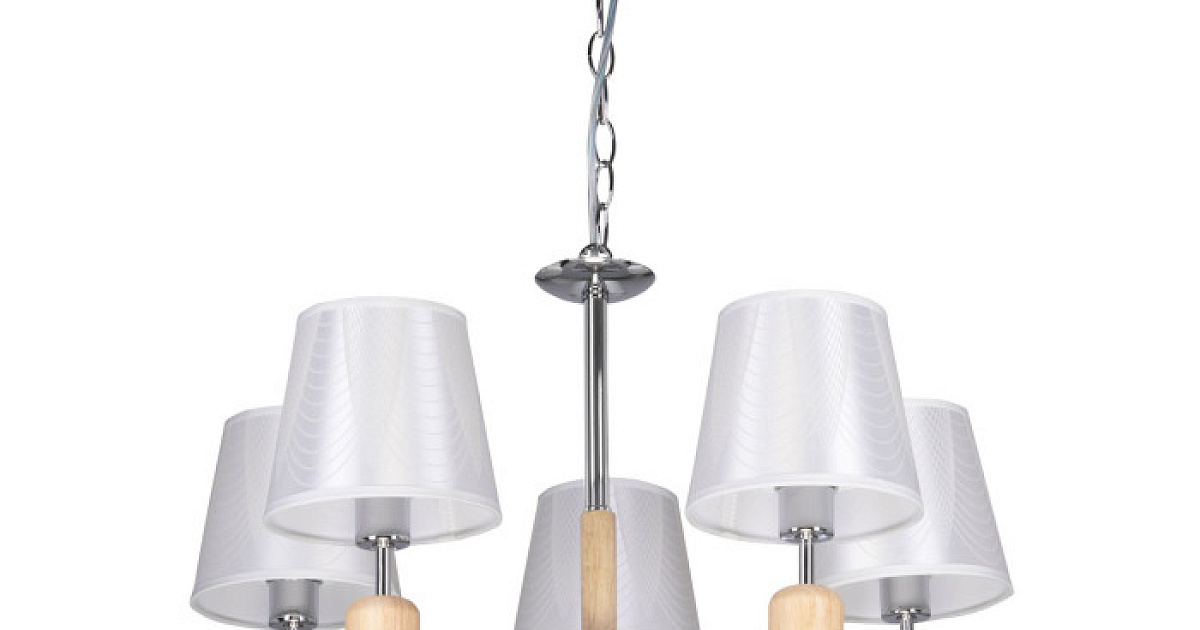 Светильник декорирован текстильными абажурами белого цвета с термостойким акрилом внутри.