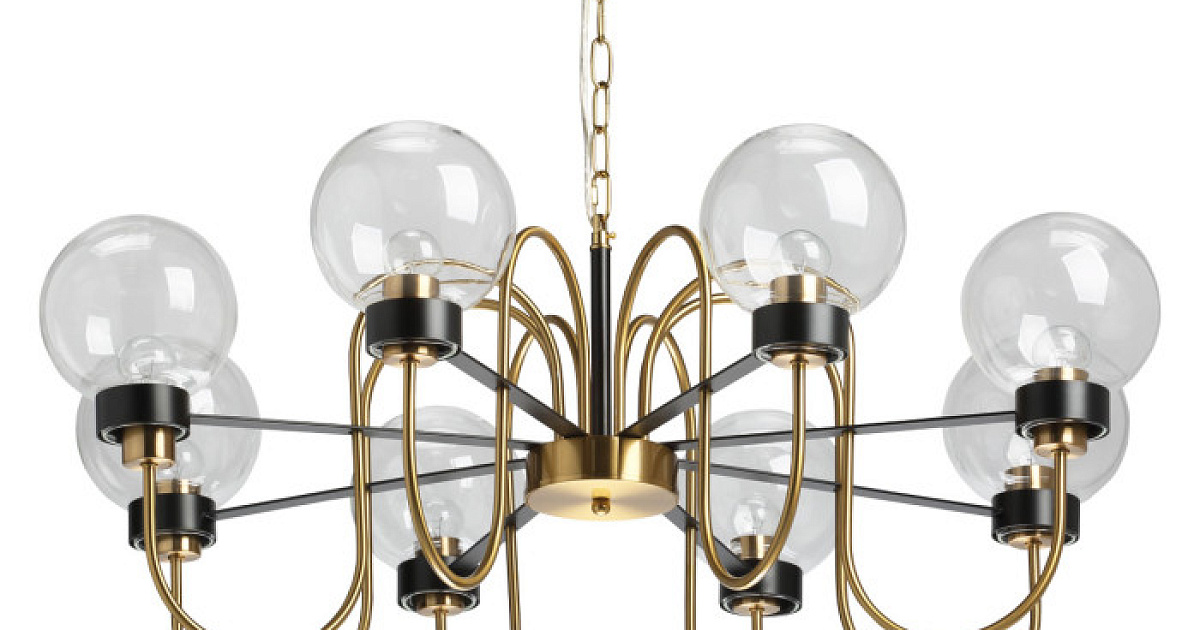 Металлическое основание подвесной люстры гальванизировано в цвет латуни. Отдельные элементы основания окрашены в черный цвет. Светильник декорирован прозрачными стеклянными плафонами ручной выдувки.