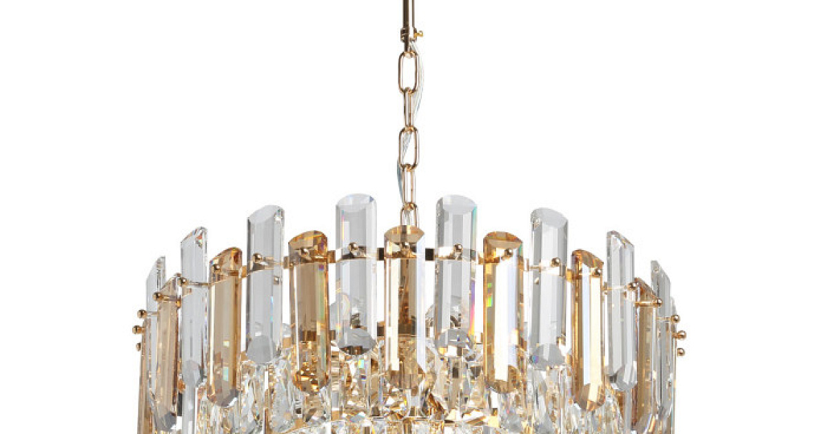 Металлическое основание светильника гальванизировано в цвет золота. Подвесная люстра декорирована крупным прозрачным хрусталем и хрусталем цвета шампань.