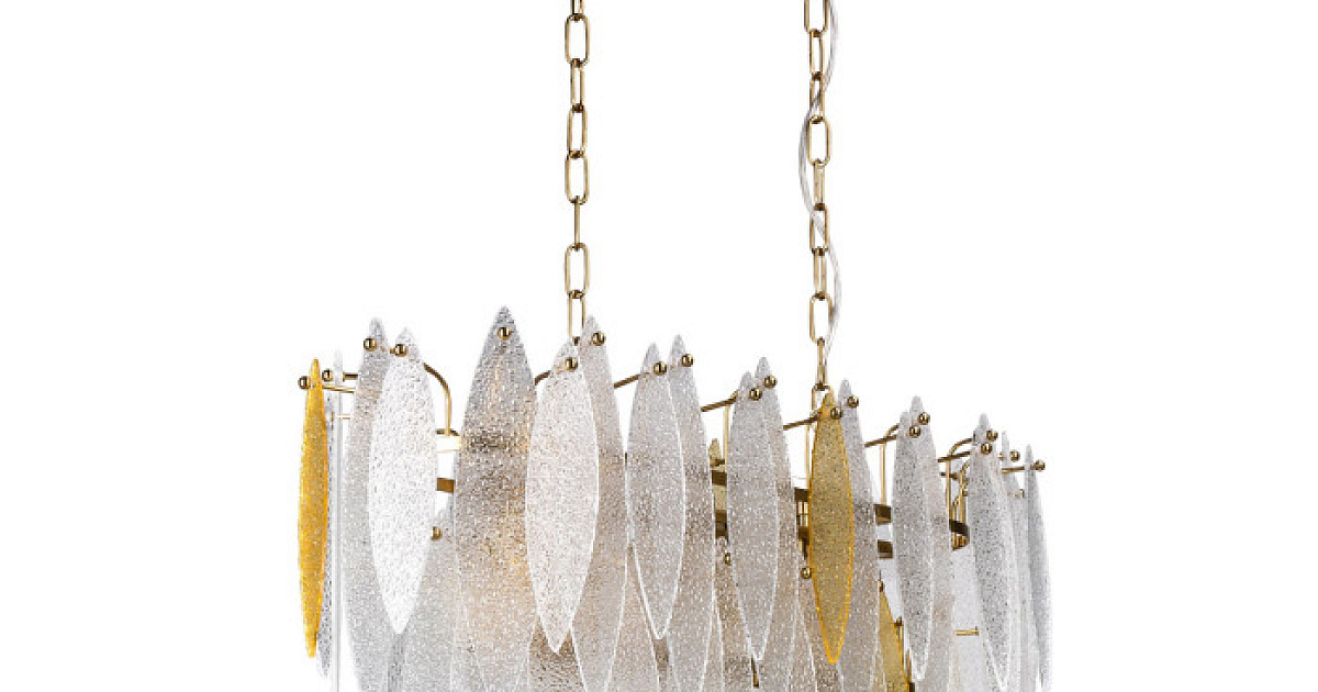 Подвесная люстра привлекает внимание необычным дизайном и гармоничным сочетанием цветов. Актуальный цвет латуни основания дополняет изысканный декор из фактурных стеклянных пластин двух цветов. Фактура вулканического стекла прозрачного и цвета шампань разбивает световой поток на множество ярких бликов, которые создают в комнате романтичную атмосферу. Возможность регулировать комфортную высоту. Заменяемые источники света удобны в эксплуатации.