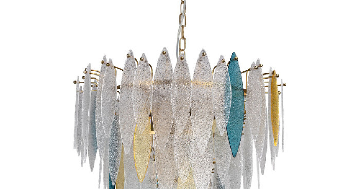Подвесная люстра привлекает внимание необычным дизайном и гармоничным сочетанием цветов. Актуальный цвет латуни основания дополняет изысканный декор из фактурных стеклянных пластин трех цветов. Фактура вулканического стекла прозрачного, нежно голубого и цвета шампань разбивает световой поток на множество ярких бликов, которые создают в комнате романтичную атмосферу. Возможность регулировать комфортную высоту. Заменяемые источники света удобны в эксплуатации.