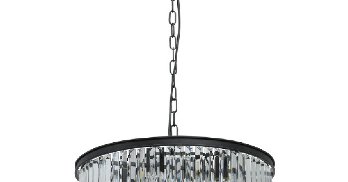 Основание выполнено из металла и окрашено в черный матовый цвет. Декоративные подвески из прозрачного хрусталя прямоугольной формы.
