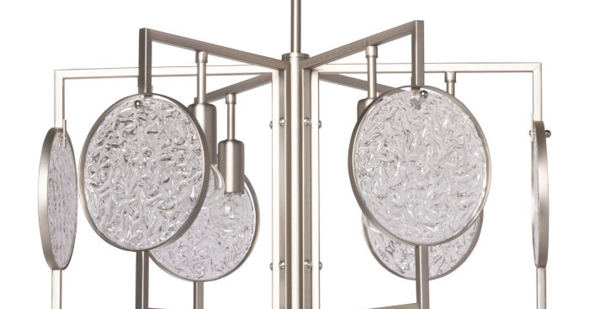 Металлическое основание подвесной люстры гальванизировано в цвет матового никеля. Декор выполнен из прозрачного фактурного стекла.