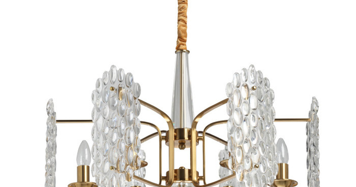 Технологичный дизайн элементов люстры соответствует стилю лофт, а цвет латуни делает эту люстру универсальной. Эффектные стеклянные пластины с регулярной фактурой закрывают свет по периметру. Проходя через фактуру стеклянных пластин свет создает красивый световой рисунок. Элементы из массива хрусталя добавляют парадности модели. Заменяемые источники света удобны в эксплуатации. Возможность регулировать высоту.