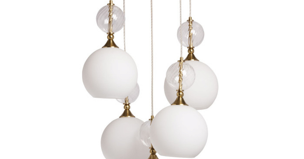 Светильник выполнен в модном минималистичном стиле. Актуальное сочетание основания цвета латуни и белых матовых плафонов подойдет для большинства классических и современных интерьеров. Белое стекло плафонов мягко рассеивает свет. Декор ручной работы в виде сферы из фигурного стекла придает люстре элегантности. Заменяемые источники света удобны в эксплуатации. Возможность регулировать комфортную высоту.