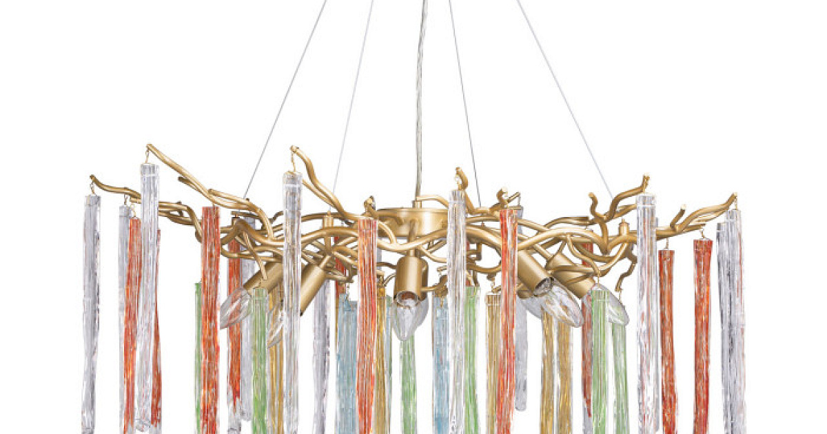 Металлическое основание светильника окрашено в цвет перламутрового золота. Люстра на тросах декорирована стеклянными элементами вытянутой формы, прозрачными и окрашенными в массе в красный, зеленый, голубой и желтый цвета.