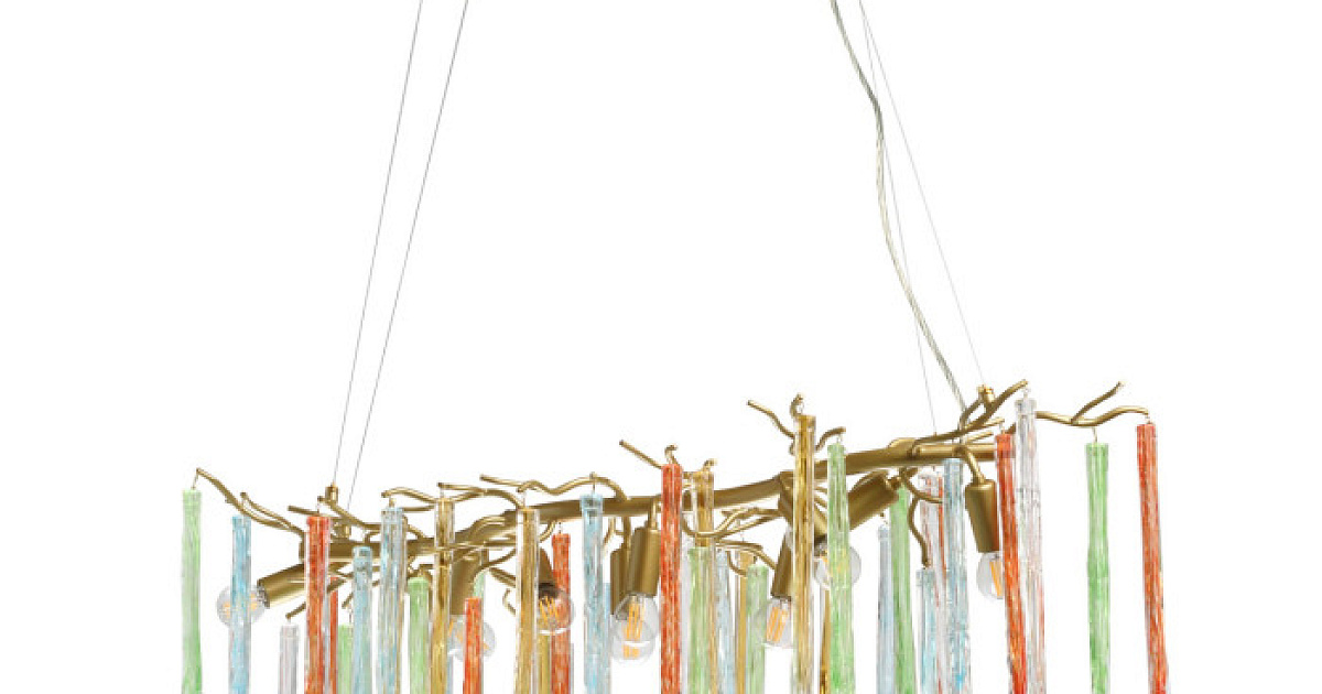 Металлическое основание светильника окрашено в цвет перламутрового золота. Люстра на тросах декорирована стеклянными элементами вытянутой формы, прозрачными и окрашенными в массе в красный, зеленый, голубой и желтый цвета.
