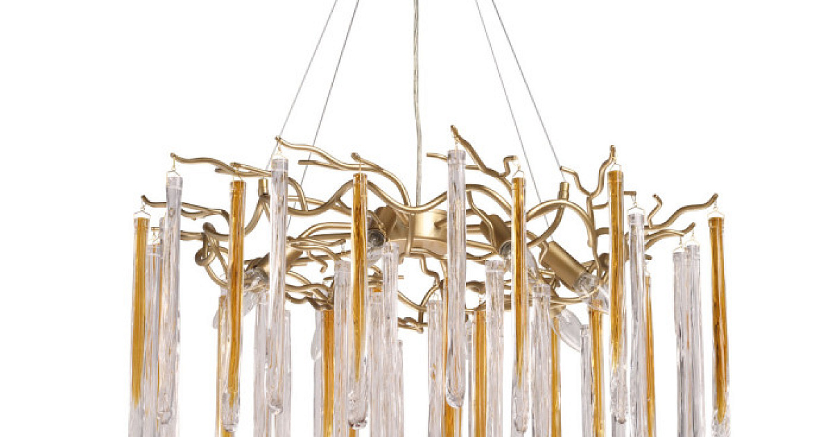 Металлическое основание подвесной люстры окрашено в цвет перламутрового золота. Люстра декорирована прозрачными стеклянными подвесками и подвесками, окрашенными в цвет карамели.