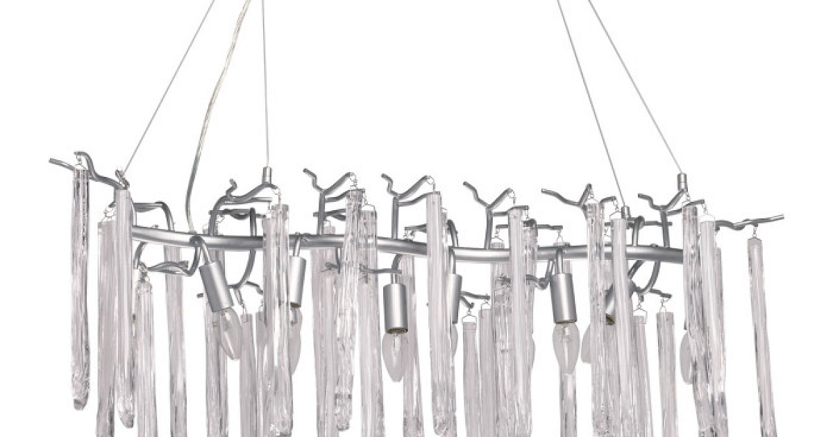 Металлическое основание подвесной люстры окрашено в цвет перламутрового серебра. Люстра декорирована прозрачными стеклянными подвесками и подвесками, окрашенными в белый цвет.