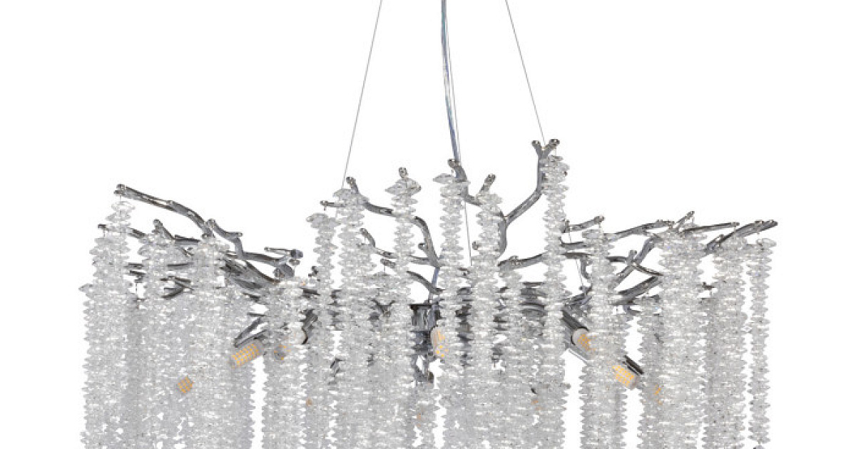 Основание подвесной люстры выполнено по технологии художественного литья из сплава алюминия с цинком и гальванизировано в цвет хрома. Потолочная чаша закрыта фактурным художественным литьем. Люстра декорирована гроздьями из прозрачного хрусталя.