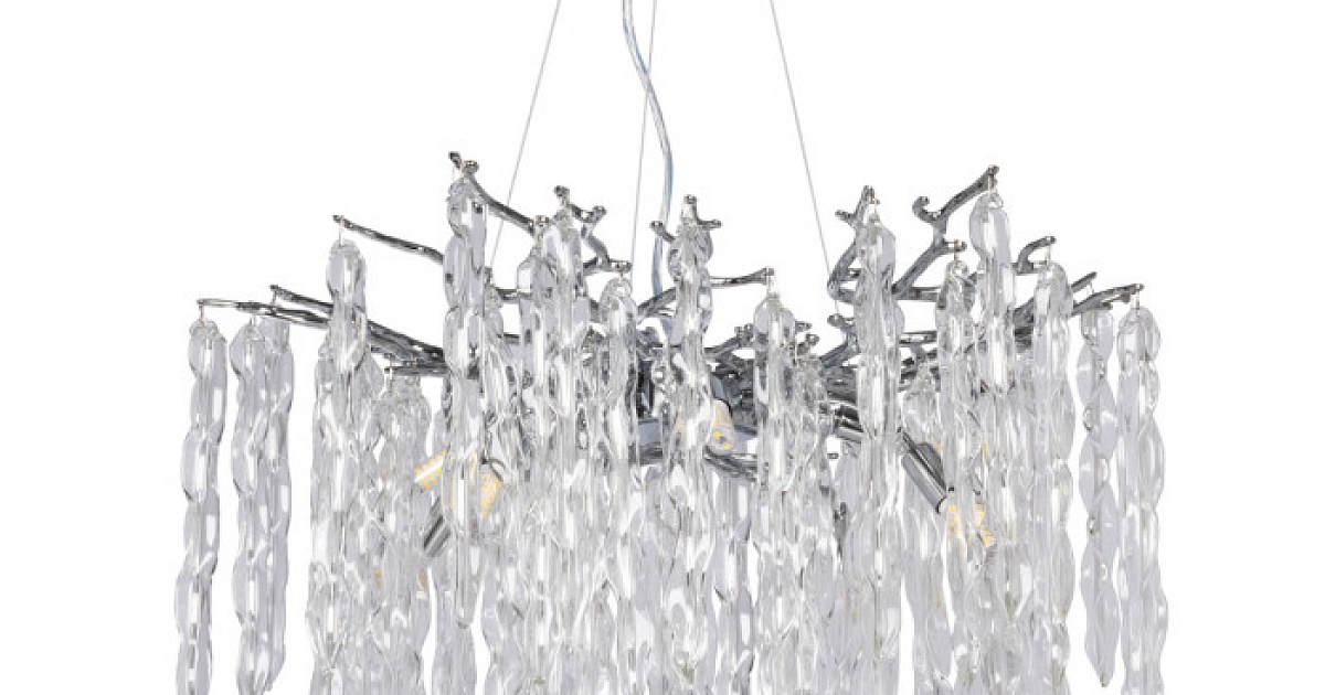 Современный дизайн с природными мотивами. Трендовая флористика, природа в доме. Декор в виде подвесов оригинальной формы из прозрачного стекла придает светильнику индивидуальность и создает эффектную игру света. Заменяемые источники света удобны в эксплуатации. Возможность регулировать комфортную высоту.