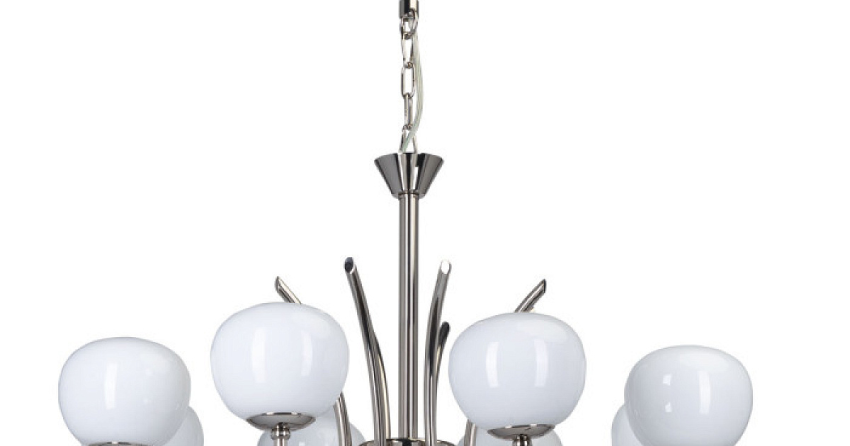 Металлическое основание светильника гальванизировано в цвет хрома. Стеклянные плафоны вытянутой формы окрашены в белый цвет изнутри.