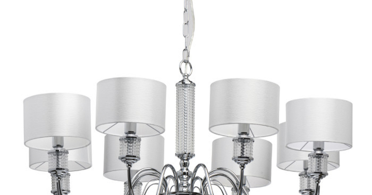 Основание светильника выполнено из металла и гальванизировано в цвет хрома. Текстильные абажура из белого атласа, внутри с термостойким акрилом, прошиты. Декор на рожках и центральной оси из прозрачного фактурного стекла.