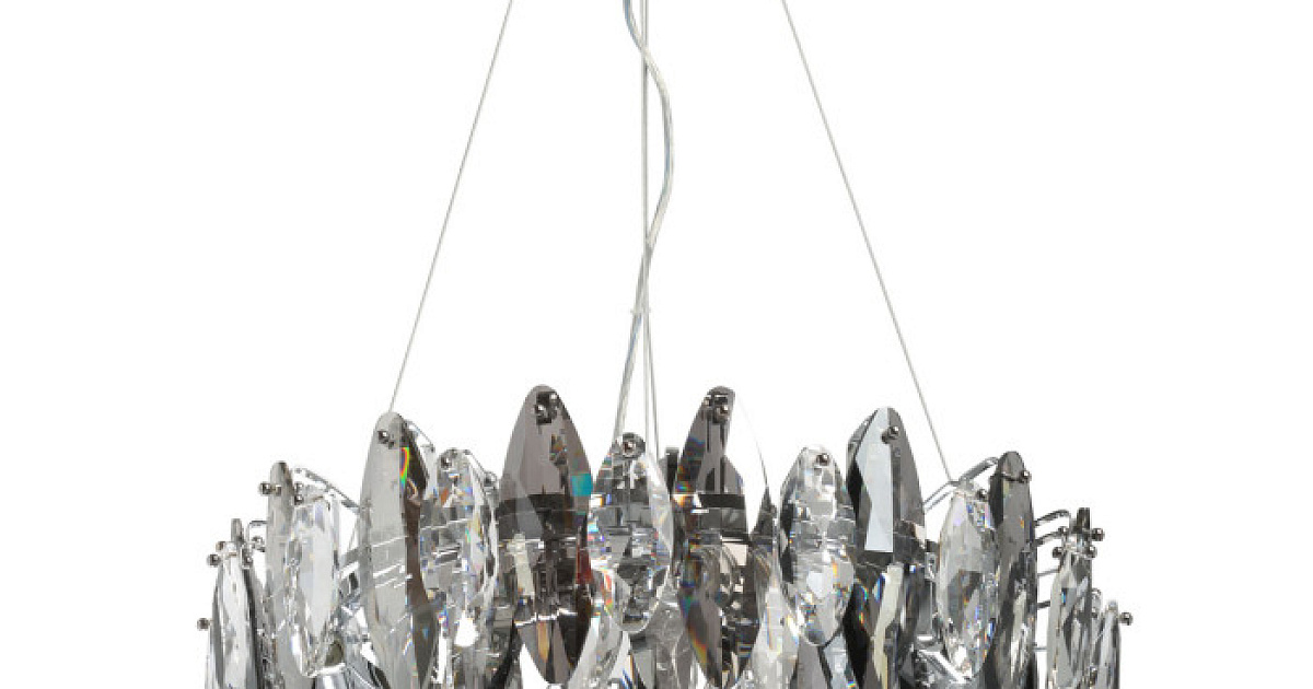 Необычный дизайн светильника за счет хрустального декора двух цветов. Прозрачный и дымчатый хрусталь высокого качества огранки. Заменяемые источники света удобны в эксплуатации. Регулируемая высота за счет тросов.