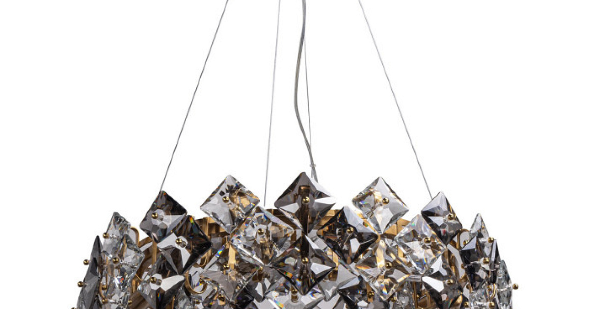Металлическое основание подвесной люстры гальванизировано в цвет латунь. Люстра декорирована прозрачным и дымчатым хрусталем квадратной формы, имитирующей природные минералы.