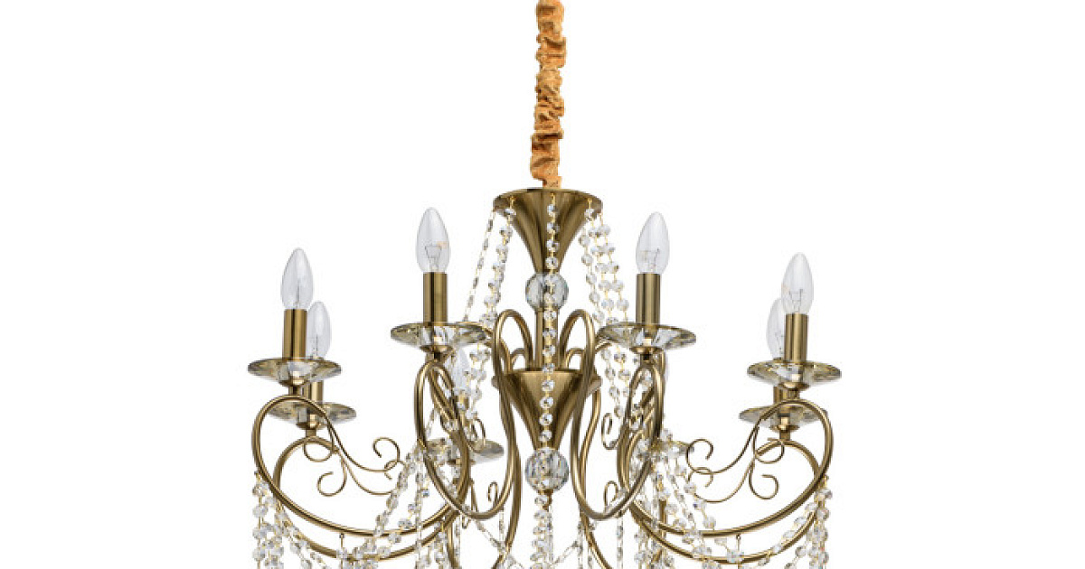 Основание светильника выполнено из металла и гальванизировано в цвет бронзы. Светильник декорирован массивом хрусталя и хрустальными подвесками цвета шампань.