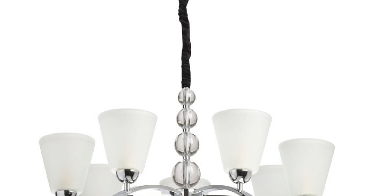 Металлическое основание подвесной люстры гальванизировано в цвет хрома. Центральная ось светильника декорирована прозрачными сферами из массива хрусталя. Источники света закрыты стеклянными плафонами, отлитыми в форму и окрашенными в белый цвет с внутренней стороны.