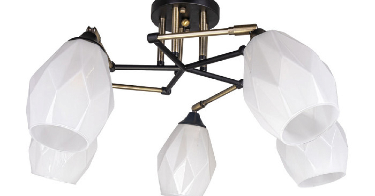 Потолочная люстра декорирована белыми стеклянными плафонами сложной формы.
