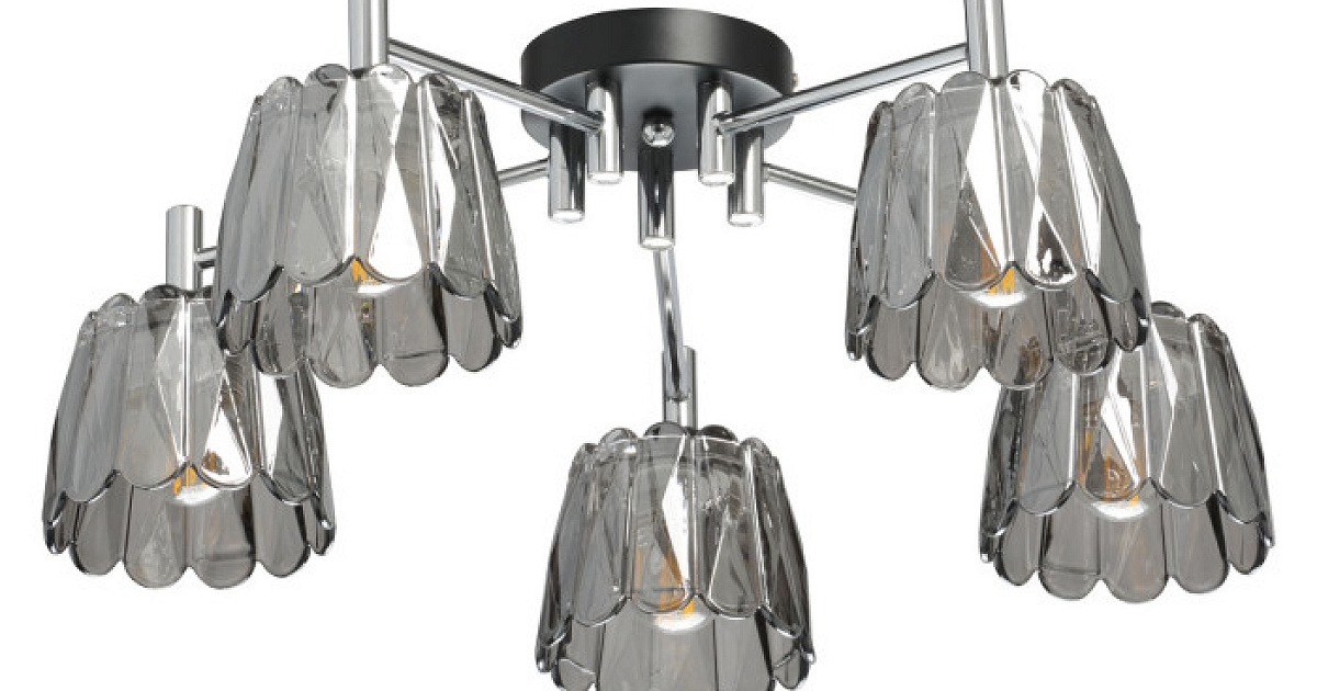 Стеклянные плафоны отлиты в сложную фактурную форму и гальванизированы в дымчатый цвет.