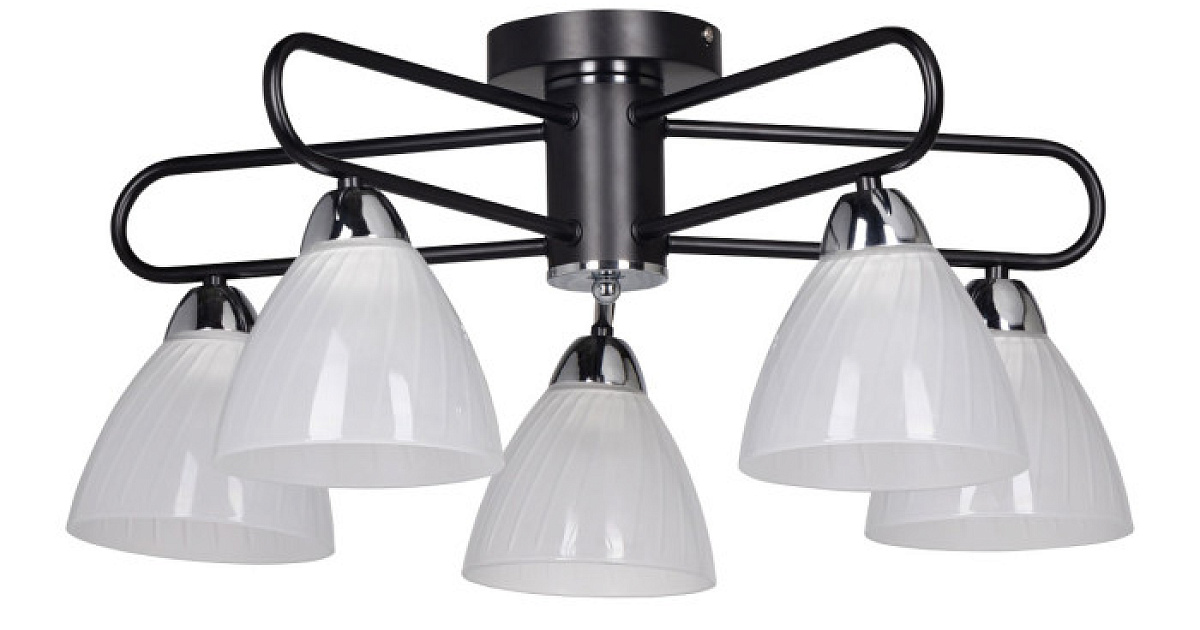 Потолочная люстра декорирована стеклянными плафонами, отлитыми в сложную форму и матированными.