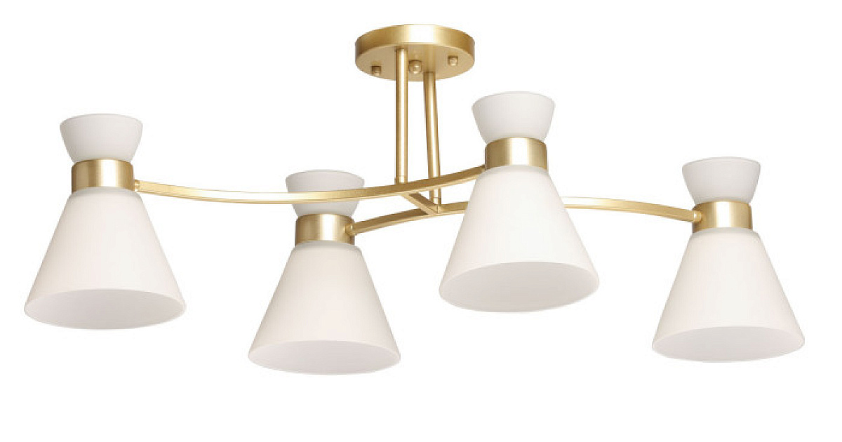 Металлическое основание потолочной люстры окрашено в цвет матового перламутрового золота.
