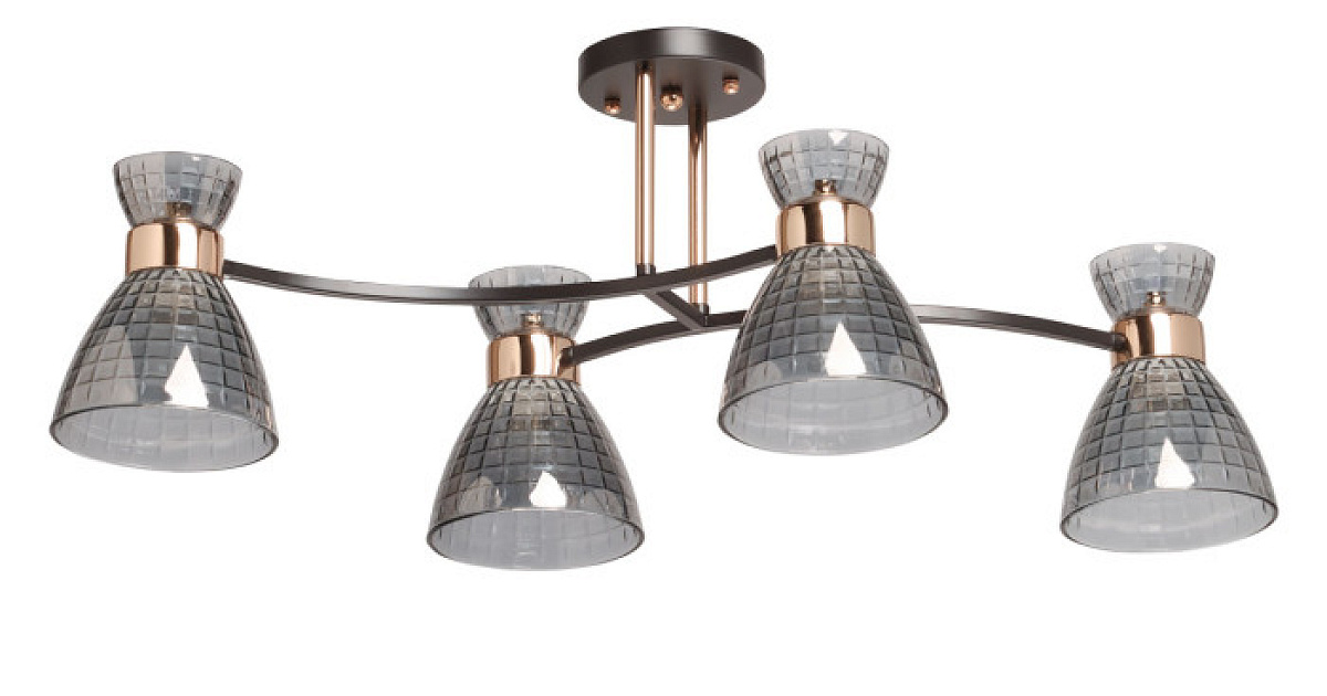 Стеклянные плафоны с геометричным орнаментом отлиты в сложную форму и гальванизированы в дымчатый цвет.