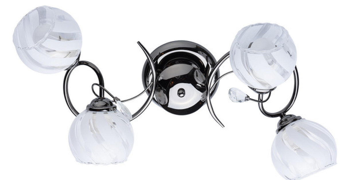 Светильник декорирован стеклянными плафонами округлой формы, отлитыми в сложную форму, с последующим матированием внешней поверхности по трафарету.