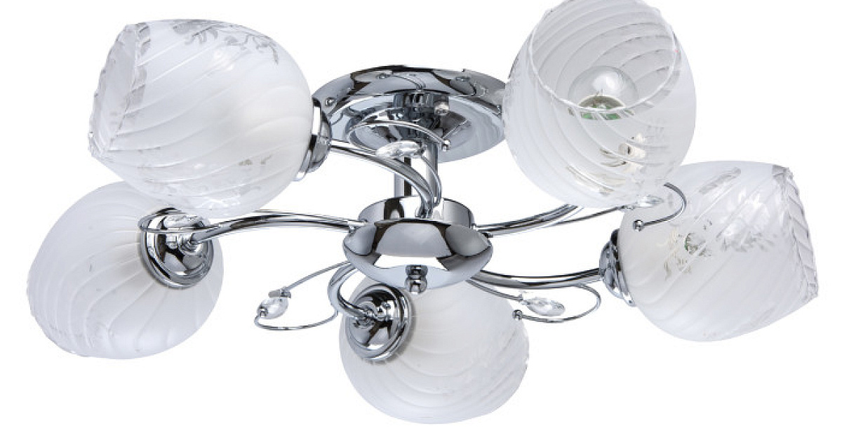 Светильник декорирован стеклянными плафонами, отлитыми в сложную форму, с последующим матированием внешней поверхности по трафарету.