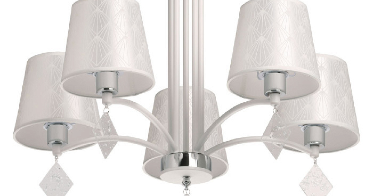 Традиционные источники света закрыты атласными абажурами белого цвета с геометричным рисунком.